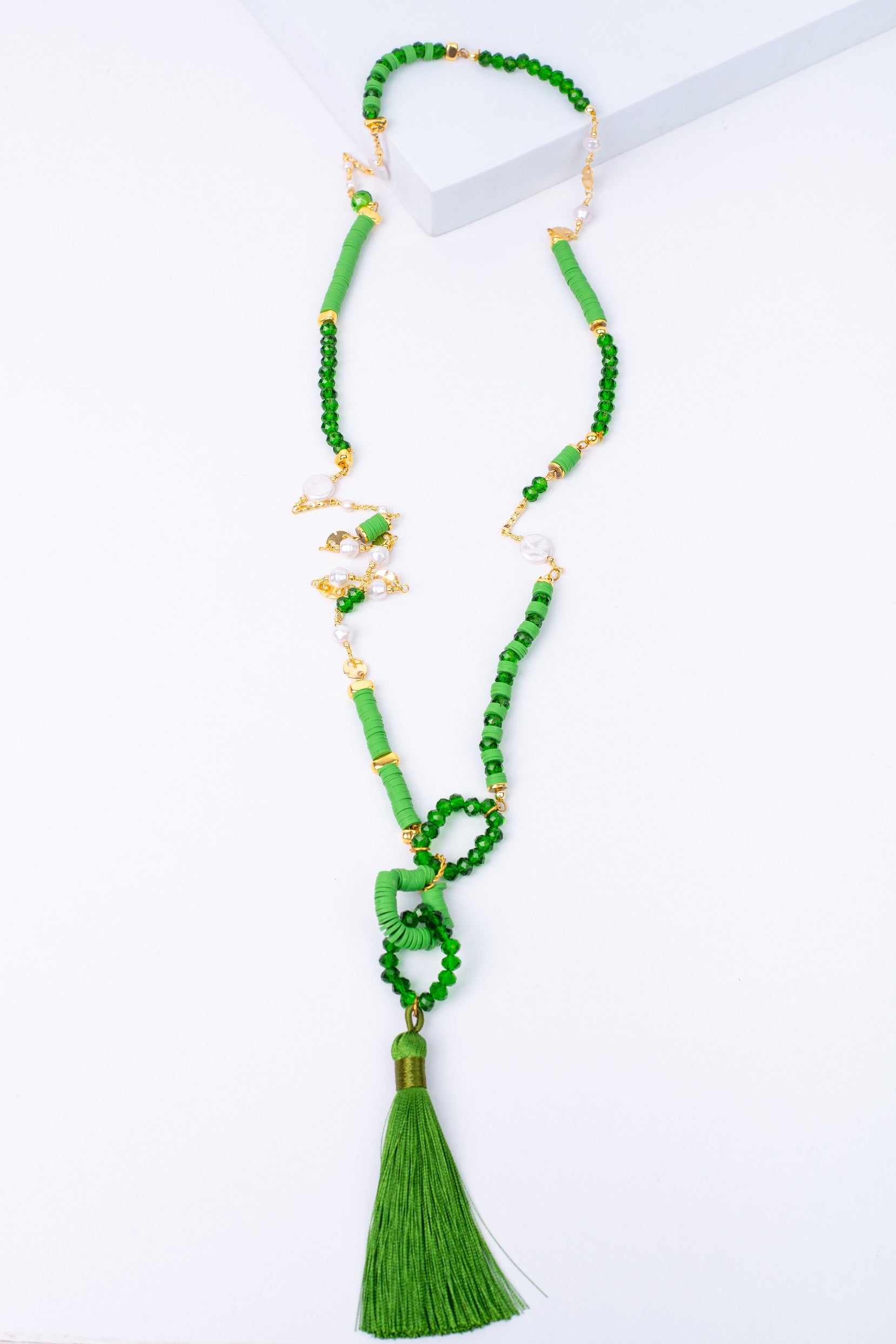 75cm rubber beads, gold faux pearls chains and crystals, tassel pandet